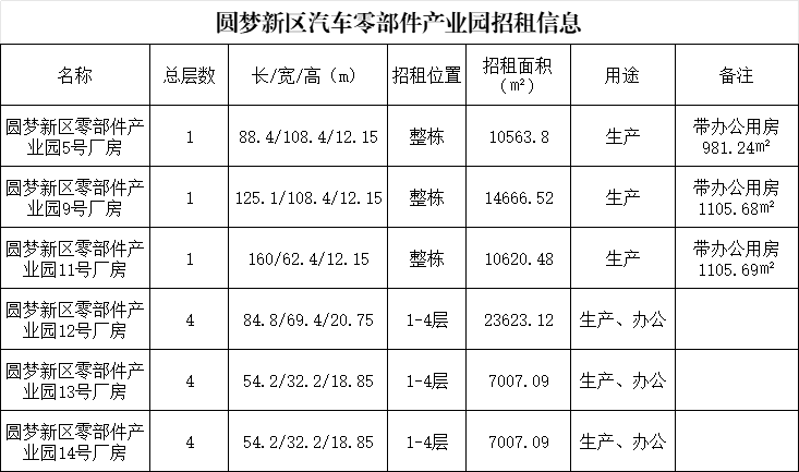 项目简介:圆梦新区汽车零部件产业园位于安庆圆梦新区环城东路,毗邻雷萨股份有限公司和振宜汽车有限公司,占地354亩。已建成11栋钢结构厂房,3栋混凝土框架厂房,以及综合楼、配电房、门房等其他附属配套设施,其中钢结构厂房局部为多层,混凝土结构厂房均为4层,可提供标准化厂房19.33万平方米。园区配套有食堂、公寓、电动自行车及新能源汽车充电桩。现有部分厂房及办公楼可对外招租。