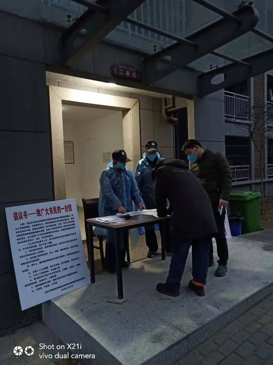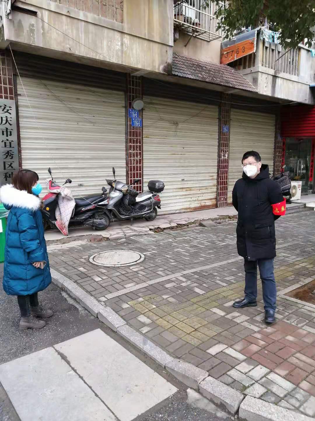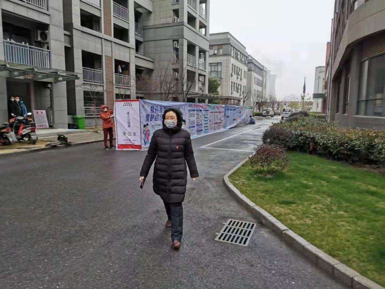 公司副总经理朱春平在社区排查登记,宣传防疫知识