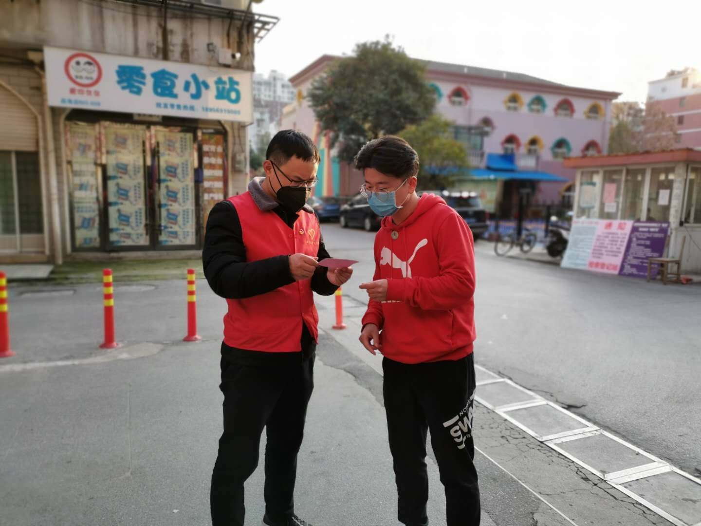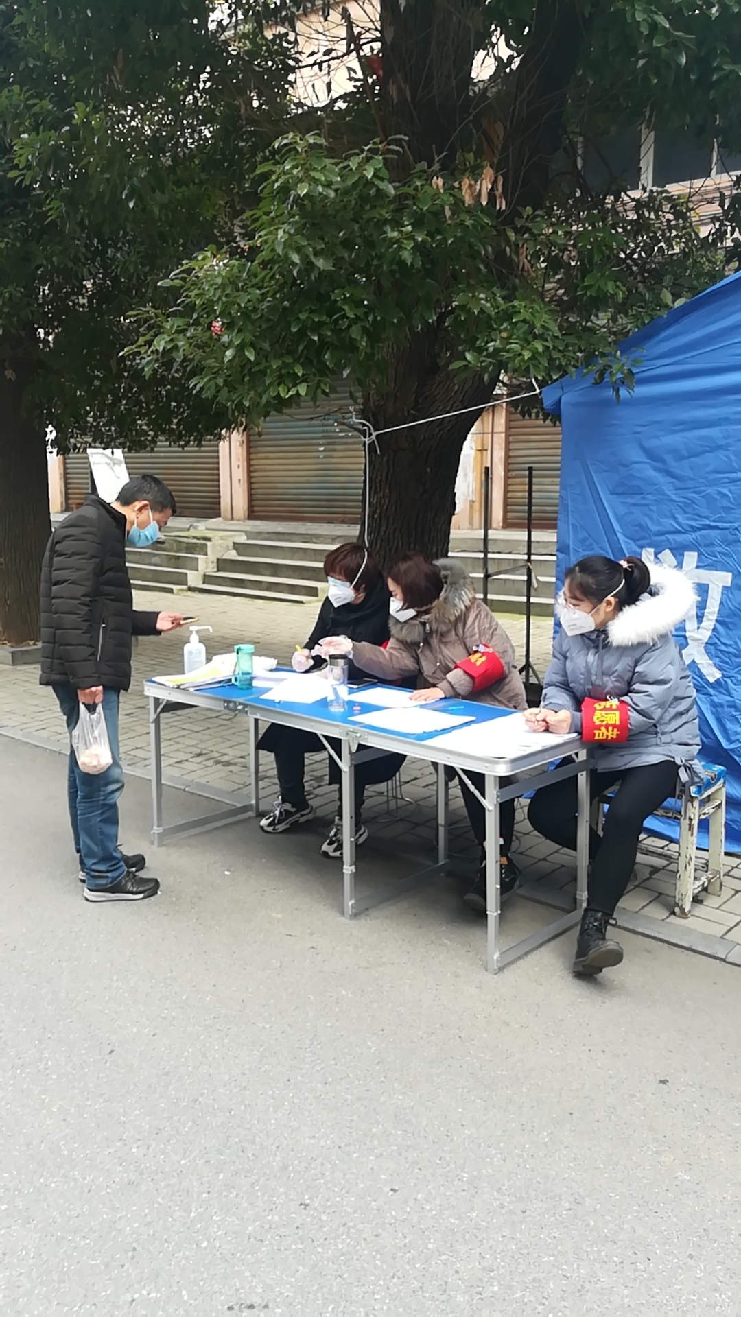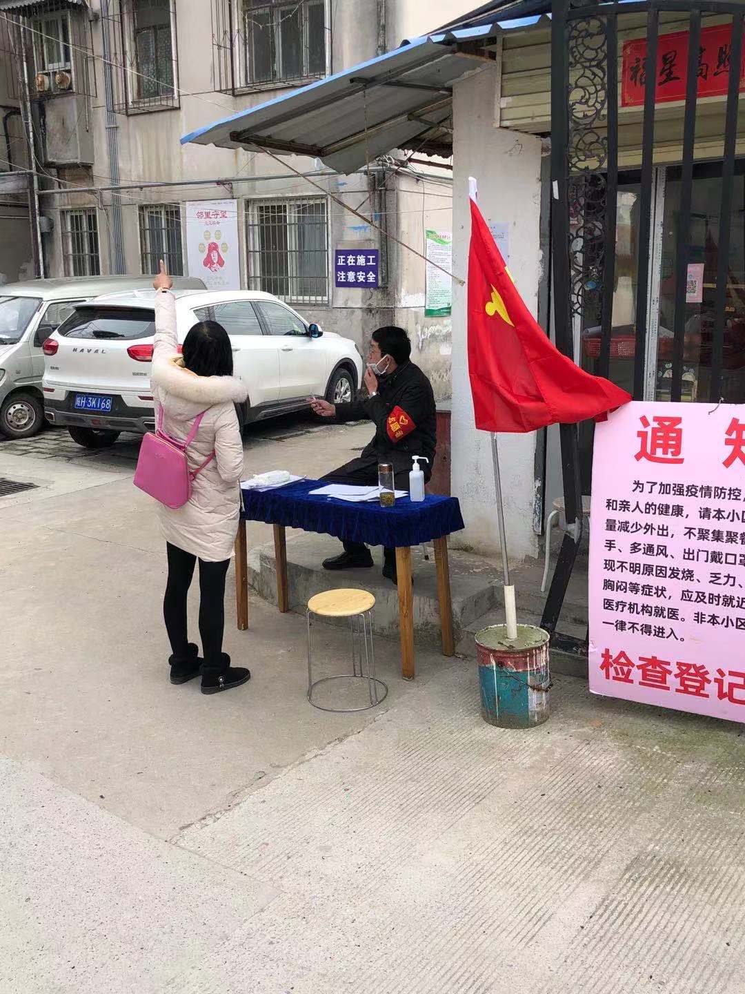 下沉社区的公司员工们给居民发出入证做登记,宣传疫情知识,量体温等